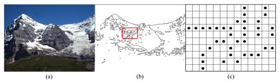 Candidate feature point extraction process. (a) Original image. (b) Edge feature. (c) Local candidate feature points map.