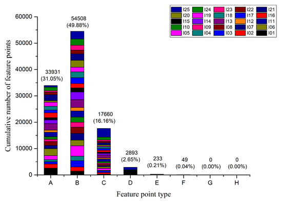 Feature point type statistics. A to H are Endpoint, Corner, Junction, Intersection, Five-line intersection, Six-line intersection, Seven-line intersection, and Eight-line intersection in turn. I01 to I25 are the numbers of 25 images in TID2008.