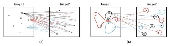 Feature point matching is the process of detecting and extracting feature points from the image, and then finding the closest corresponding point according to a preset measurement criterion. Figure 5 shows two different matching ideas. Figure 5a shows the general feature point matching, and Figure 5b shows the classification matching of feature point.