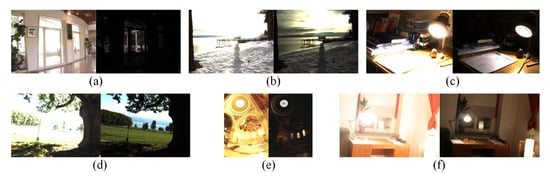 Figure 6 contains six groups of experimental materials with different exposure value. Each group of materials consists of two images of the same scene. The left image is overexposed, and the right image is underexposed.