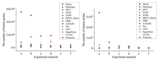 Number of feature points. On the left are the feature points extracted from the overexposed images, and on the right are the feature points extracted from the underexposed images. The X-axis serial number corresponds to experimental materials in Figure 6.