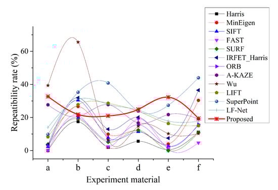 In addition to the number of feature points and matching points, the repeatibility rate is also a commonly used evaluation indicator. It intuitively reflects the proportion of matching feature points in the extracted feature points and is used to characterize the availability and repeatibility of the feature points extracted by the feature detector. The repeatibility rate is shown in Figure 8.