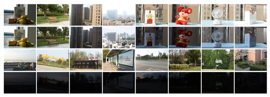 When the camera settings and pose are fixed and only the capture time is different, a series of images with different illumination directions or intensities can be obtained, as shown in Figure 9. The first and second rows correspond to the same scene, the capture time of the first row is in the morning, and the capture time of the second row is in the afternoon. Therefore, we collectively refer to the first two rows as Morning-Afternoon dataset. The third and fourth rows correspond to the same scene, the third row of images were captured during the daytime, and the fourth row was captured at night. We call the last two rows Daytime-Night dataset. From left to right, the first column is named Scene_1, the second column is named Scene_2, and so on.