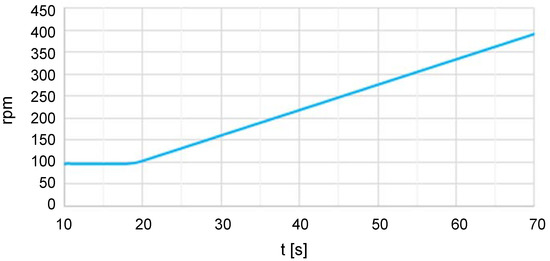 The oscillating group was tested with and without the door gasket to assess the effects. As the laundry distributes unevenly within the drum, we analyzed two loading conditions with magnets located at different positions in the drum, i.e., a middle load of 1 kg and a counter load of 2 × 0.5 kg to consider the static and dynamic unbalance, respectively. According to the manufacturer’s test protocol, we measured the displacement of the tub at six points, i.e., three at the rear of the tub, (, , ), and three at the front part, (, , ). Figure 1 shows the positions and measurement directions. The displacements of these points were recorded using piezoelectric accelerometers connected to multianalyzer Pulse 3160-A-042, which was controlled by a computer with PULSE® LabShop software from Hottinger Brüel & Kjær company. The tests were performed for 70 s, and the speed of the drum was increased from zero to 400 rpm using a low constant acceleration of 7 rpm/s, as this setup enabled the resonance step to be prolonged and the maximum displacements to be analyzed more effectively. Figure 2 presents the velocity ramp where the frequency corresponding to each time can be determined. Each measurement was repeated five times.