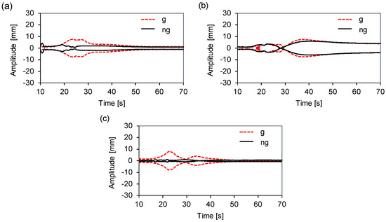 To facilitate the comparison of the recorded signals, after applying 0.5 and 20 Hz fourth-order Butterworth filters, we developed an application in Matlab® to obtain the upper and lower envelopes of the displacement signals in the time domain. In Figure 3, three out of the twelve displacement envelopes obtained are displayed. To detect the points at which the greatest differences between the envelopes may occur for each loading condition, which will be analyzed in more detail in the future sections, we propose to use the maximum amplitude as an indicator.