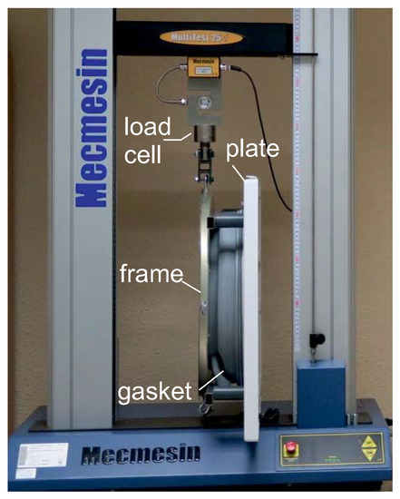 A 25 kN load cell sensor of a tensile testing machine (Mecmesin, Multitest-i 25 model) was attached to this metal frame at different positions. Depending on the test performed, the testing machine shifted this metal frame such that the gasket underwent axial, radial, or torsion deformations.