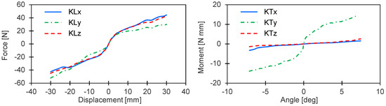 The experimental results are summarized in Figure 6, which shows the force vs. the displacement and the torque vs. the angle. The nonlinear gasket responses in compression and tension were equivalent; furthermore, we observed similar behaviors in the x- and z-directions owing to the symmetry of the ring shaped gasket. On the y-axis, the gasket was stiffer under rotation but more flexible under linear displacement. These measured stiffness splines were implemented in the multibody model before the damping parameters were determined in the next step.