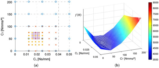 Several optimization methods [31], such as the bisection method or the gradient method for optimization, can be used to minimize f. However, we considered a grid optimization method, which is a derivative-free method. This method provides a sufficiently favorable solution in a short computational time. Based on the experimental tests, we restricted our attention to the interval Ns/mm for and Nmms/ for . These intervals provided the region of interest, denoted by , for vector . An Adams® -Matlab® co-simulation process allows us to approximate the objective function f on the domain and to focus on the promising areas of . The optimization process begins with this domain discretized into a uniform grid with 25 points, as displayed as circles in Figure 7a. A grid search iteration involved considering for every grid point , the model developed in Adams®. This model was executed using the damping parameter values provided by the grid point to obtain the displacement values and to compute the corresponding value of the objective function f. We selected the grid point with the best objective function value for the next step. A half-size refined mesh was defined around the selected grid point (cross marks in Figure 7a), and a new grid search iteration is implemented. The successive iterations refined the mesh, as shown in Figure 7a. The process was terminated when there was no progress on the minimization of ; this happens when the difference between the value of the objective function f computed in two consecutive iterations becomes lower than 0.02. A surface plot of the objective function f is displayed in Figure 7b. For the values of the damping parameter = 0.019 Ns/mm and = 60 Nmms/, the function f yielded the lowest value; therefore, it was selected as the optimal solution.