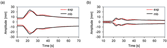 The results yielded by the multibody model, which considers the optimal damping parameters above, agreed well with the displacement results measured experimentally under both unbalanced loads. By analogy, we used Equation (1) to compute the percent difference between the maximum amplitudes provided by both scenarios , for each point .