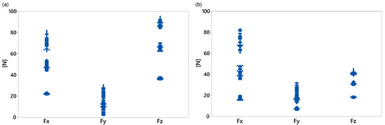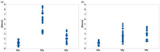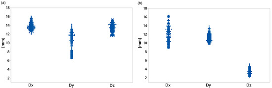 Figure 10 shows the maximum displacement during the transient state at each direction for both loading conditions. For the middle load (Figure 10a), the lowest displacement, but with more variability, was on the y-axis. The maximum displacement data in the x- and z-directions were similar and ranged from 11.5 to 16.1 mm. However, for the counter load (Figure 10b), the smallest maximum displacement with the least variability in the data was in the z-direction and ranged from 2.1 to 5.2 mm. Figure 11 and Figure 12 show some data clusters. An analysis of variance (ANOVA) can identify the factors that significantly affect the response variables and the level of those factors that yield the best values for the response variables.