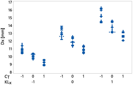 For instance, the mean value of with counter-loading condition was 11.99 mm. The most influential factor was , which contributed to 70.64% of variability. If factor level −1 is selected, then the mean value would be reduced by 1.91 mm. These effects are displayed in Figure 13. In this chart, the values of the response variable collected by the D-optimal design are displayed in the vertical axis for each factor level combination of and shown on the x-axis. Decreasing the value of and increasing the value of can reduce the maximum displacement in the x-direction more effectively.