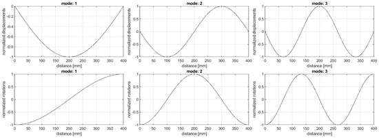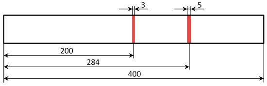 In this study, the vibration of the Euler-Bernoulli beam was simulated with the finite element analysis to obtain the first three bending natural modes of vibration according to the studies reported in [76]. The aluminum beam model with the length of 400 mm, the width of 40 mm, and the thickness of 3 mm, and the following material properties: Young’s modulus of 67.8 GPa and the density of 2700 kg/m3, was discretized in 2263 equally spaced finite elements. The definition of such a dense finite element mesh is related to a possibility of obtaining high-resolution data using shearography, the optical NDT technique used by the author in damage identification studies in the previous works (see e.g., [77,78]). Each element was of 2 nodes, having two displacement and two rotation values (see Figure 1). The modal displacements and rotations were determined for the intact beam as well as for the damaged beam, considering the first damage in the form of a slot of the width of 5 mm and located at the distance of 284 mm and the second damage in the form of a slot of the width of 3 mm and located at the distance of 200 mm from the beam end (see Figure 2). For the damage identification study, eight damage scenarios were defined by combining the thickness reduction of the two slots, the respective values of which are shown in Table 1. Both displacements and rotations were collected as the results of simulation (see Figure 3).