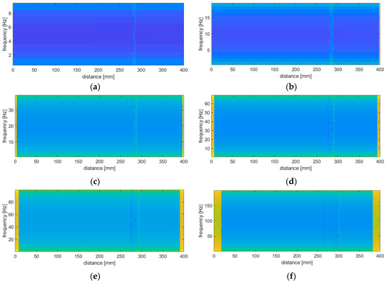 The influence of the frequency range on the damage detectability: the ranges of 0–10 Hz (a), 0–20 Hz (b), 0–40 Hz (c), 0–70 Hz (d), 0–100 Hz (e), and 0–200 Hz (f).