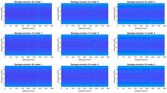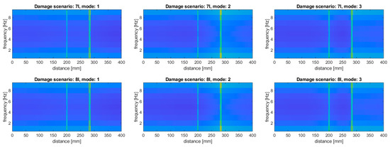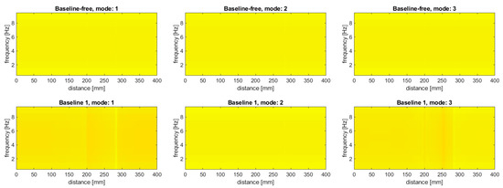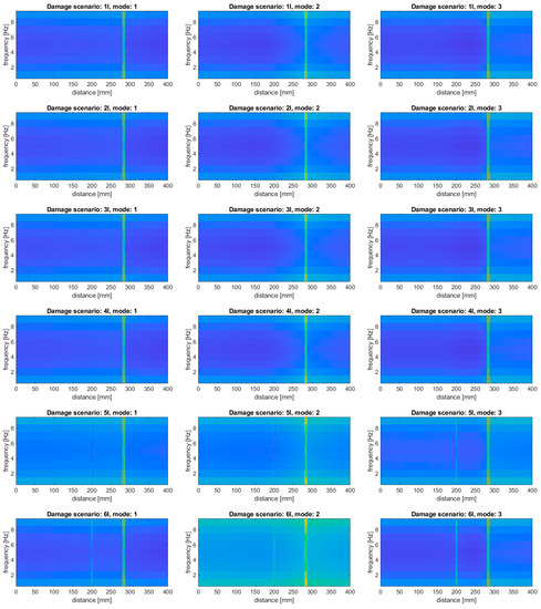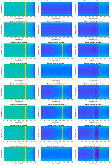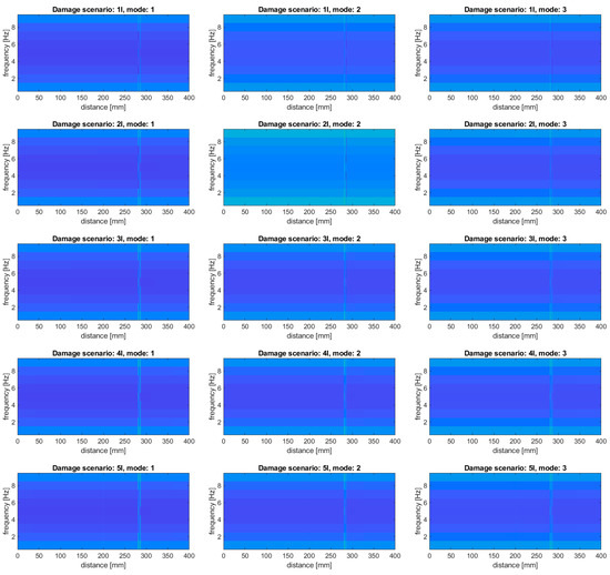 Analyzing the results presented in Figure 7, one can notice that all the damage signatures in all the considered scenarios are well detectable. Comparing these results with the results obtained using the baseline approach based on transformation of mode differences, it can be stated that the performance of the following approach is better, since the distinguishability of the second damage, especially for the second mode in particular damage scenarios, is much better when the latter approach was used. Moreover, it can be observed that the boundaries of the simulated slots are well identifiable in the case of using the second baseline approach, which were undetectable in the most of damage scenarios when the first baseline approach was used. The superiority of the second baseline approach over the first one is justified theoretically, due to the lack of additional disturbances caused by transforming the differences of modes, which was discussed in the preamble to Section 4.2.