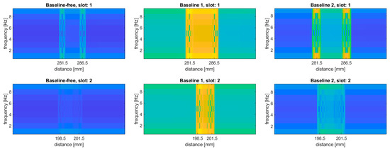 As it can be observed, the applied baseline-free approach makes it possible to identify all the simulated damage, including the damage scenario 5I, where the second damage became detectable. Moreover, the observed damage signatures are characterized by significantly higher distinguishability compared to the results of the baseline-free approach. However, in contrast to the results obtained using the baseline-free approach, the damage signatures observable in the obtained results using the presented baseline approach are blurred, which makes it impossible to identify the boundaries of the simulated slots.