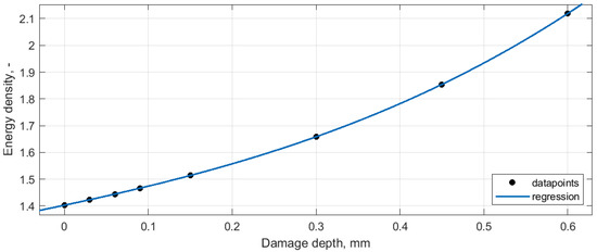 The obtained values of the energy density for the investigated damage scenarios were subjected to the regression procedure in such a way that for particular approaches and particular modes the energy density values were plotted in a function on the increasing damage depth. This operation allowed to confirm the proportionality of the increase of the determined energy density values with respect to the considered damage depths. The cubic polynomial function was used for the regression due to the best fitting performance and the connection with the character of influence of a thickness reduction on the resulting structural stiffness. The estimation of the crack depth relationship with the local stiffness reduction based on polynomials is widely used in the literature (see e.g., [82,83,84,85]). The exemplary plot and the results of regression are presented in Figure 10. Note that the energy density for the intact beam was determined in the same way as for the damaged beams.