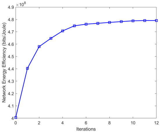 First, we evaluate the performance of our proposed framework with regard to the number of iterations. Setting the number of users to 10 per BS, the number of BSs to 10, is set to 10 W, and W. Figure 1 shows the EE of the network obtained by our algorithm versus the number of iterations. One can observe that the EE increases with each iteration and reaches the convergence point in a few iterations. Despite the relatively slower convergence speed of the proposed method compared to the conventional FP methods, the proposed method has the advantage of exploring all of the solution space.