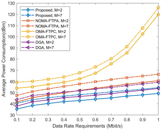 Figure 2 and Figure 3 illustrate the performance comparison with regard to the required data rate and corresponding power consumption to achieve that rate. In Figure 2, using similar values for the parameters, it is clear to observe that the proposed algorithm can achieve better performance in consuming lower power to reach the required rate followed by the DGA and NOMA-FTPA. OMA-FTPC has the worst performance among the four methods. It can be noticed that the increase in the number of users leads to higher power consumption for the sake of offsetting the ICI and fulfilling the data rate requirements of the users.