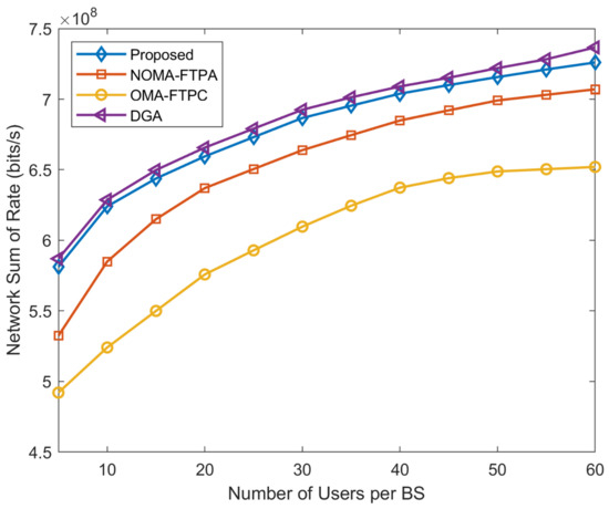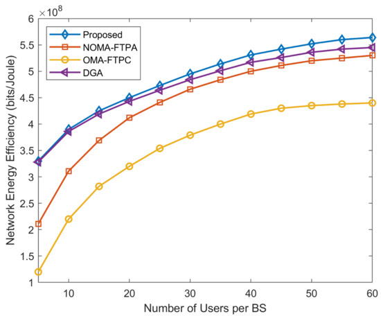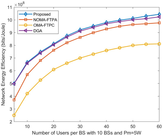 The EE of the network for the different number of users per BS is shown in Figure 5. It can be seen clearly that the EE of the network increases with the increasing number of users. The number of users varies from five to 60 per BS; the number of BSs was set to 10; W; W; and Mbits/s. We can also observe that the increment of EE is rapid for a lower number of users and rises slowly with a higher number of users. For example, when the number of users is between five and 30, the EE rises from bits/Joule to for the proposed method, from bits/Joule to bits/Joule for DGA, and from bits/Joule to bits/Joule for NOMA-FTPA.