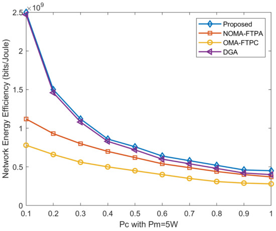 Figure 7 represents the performance comparison of our proposed method with other methods with regard to network EE with different circuit power varying between 0.1 W and 1 W. It is obvious that the EE deteriorates with the increasing of circuit power consumption and Mbits/s. Therefore, reducing is one of the major goals in both device design and the research in the field information-theoretic and resource allocation. Nevertheless, it can be seen that the proposed method has the best performance among all methods. This superiority becomes clear with the growth of the circuit power consumption, especially in comparison with the DGA. When the circuit power is 0.5W, the proposed method has 6.25%, 15.6%, and 37.5% higher energy efficiency than the DGA, NOMA-FTPA, and OMA-FTPC, respectively.
