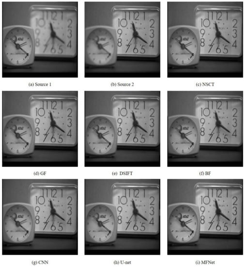 Figure 3 compares the results of our proposed MFNet with the other best performing multi-focus image fusion approaches on the “Clock” image set. It is evident that our proposed algorithm provides the optimum fusion result among these methods. To aid comparison, we depict the magnified regions of the fused images taken from Figure 3, as shown in Figure 4. The results clearly show that the fused images from MFNet contain no obvious artifact in these regions, while the fused results from the other methods contain some artifacts around the boundary of focused and defocused clocks (highlighted with green rectangles) and pseudo-edges (highlighted with red rectangles).