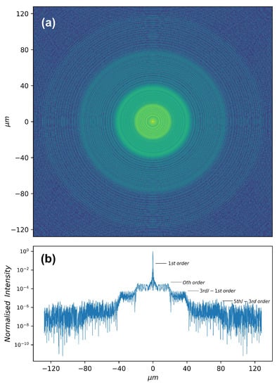 The simulated PSF at f is shown in Figure 2. Several orders appear: the +1st order focal spot, the 0th order undiffracted beam, the 3rd-order overlapped with the −1st order, etc. By the similar triangles and the Equation (9), the radius of each order circle at f is given by
