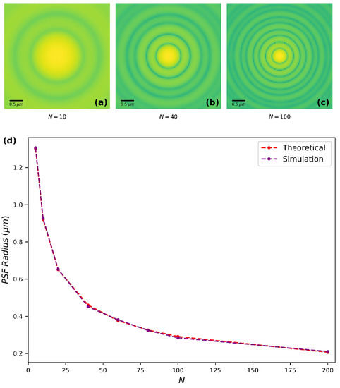 Further tests have been achieved by comparing the output of our model with theoretically calculated PSF of the FZP with different number of zones from 5 to 200 (Figure 3). For this calculation, a point source that emits a pure spherical wave is placed at from the FZP. Three examples of numerical outputs with different number of zones N are displayed on Figure 3a–c. The variation of the PSF spot radius (the distance between the central maximum and the first minimum) versus the number of zones N is displayed in Figure 3d. When N increases, the PSF spot radius decreases. The theoretical spot radius calculated by the classical formula set by the Rayleigh criterion [17] (see Equation (12)) is reported and compared to the numerical results.