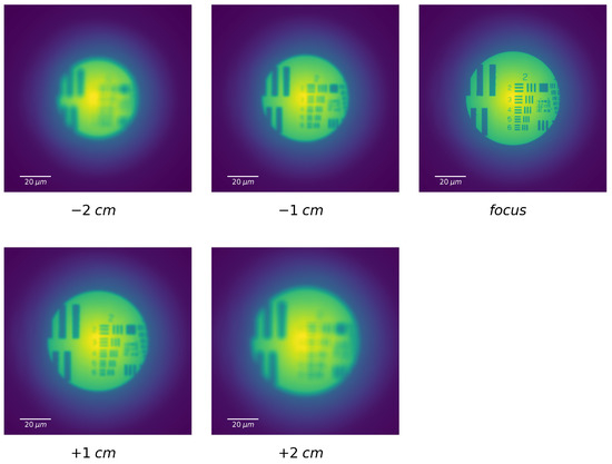False color numerical images of a USAF 1951 target are recorded at various distances from the image plane in focus (called focus). The recorded distance is referred to the focal plane under each image. The focus is taken as the origin, and the negative and positive signs, respectively, represent the directions closer and further to the FZP. The FZP has the same parameters for Figure 2. The object to FZP distance is and leading to the creation of an image on focus is at . Each image dimension is m.