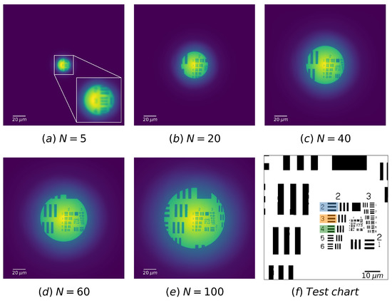 To our best knowledge, the quality of the image formed by a FZP versus the number of zones has never been studied. In order to perform this study, a set of incoherent images of the test chart were simulated for various numbers of zone N. The numerical images are carried out with the same FZP as well as the same geometry as for Figure 4. The results are displayed in Figure 5a–e and the part of interest on the test chart is zoomed in Figure 5f. It is apparent from Figure 5a–e that as N increases, the image becomes sharper. As the radius of FZP is meanwhile broadened, the field of view is enlarged.