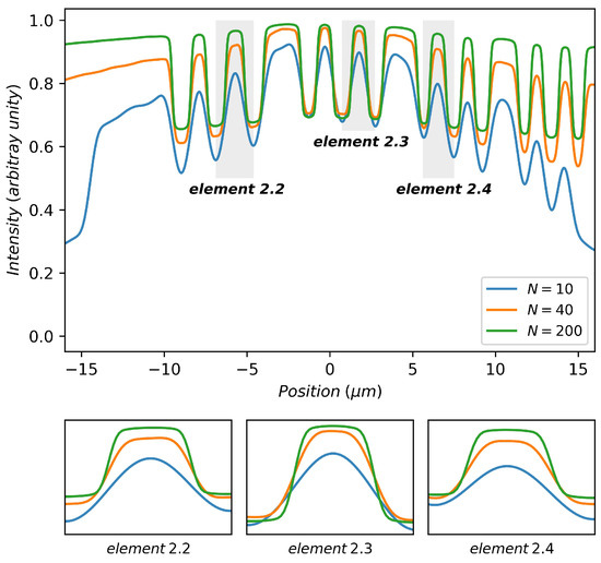 The variation of image quality with the number of zones is more evident in the intensity profile plot of bars. For example, the intensity profile of three groups of bars on the test chart (the blue-, orange-, and green-colored parts in Figure 5f are, respectively, named as elements 2.2, 2.3, and 2.4 in the following text) are plotted in Figure 6, varying the number of zones N. For the ease of comparison of the profile shape, the intensity plots have been normalized. While N increases, the plot shape of a bar approaches to a rectangle, which indicates the decrease in the PSF spot size (see in the inserts of Figure 6).