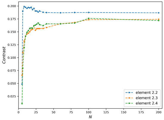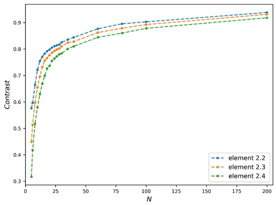 Compared to Figure 3d, the contrast plots reach stabilization with a larger N than that corresponding to the needed PSF spot size (equal to the width of bar). Taking the bars of Element 2.3 as an example, the PSF spot size is already below the bars width when , but the contrast plot roughly reaches stabilization at . This delay of N is due to the fact that the stabilization of contrast requires the complete separation of points without overlap, which is stricter than the Rayleigh criterion used in Equation (12). Another remark in Figure 7 is the contrast value, whose maximum is as low as 0.2. In order to study its origin, we modeled the image formation with a theoretical perfect refractive lens. Supposed the FZPs in Figure 7 can be replaced by the refractive lenses with the same numerical aperture (NA), the transmission of refractive lens is defined as
