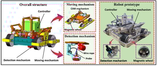 A wall-climbing detection robot adapted to different curvature walls was developed while considering the varied morphology of petrochemical tanks. The robot mainly comprised an adaptive moving mechanism, magnetic adsorption wheels, and a flexible detection mechanism with multi-DOF. The working environment of the robot comprises facades with different curvatures. Thus, solving the problems of the safe adsorption and stable movement of the moving mechanism, as well as the flexible adaptation and accurate measurement of the detection mechanism, was necessary. Therefore, a wall-climbing robot with flexible detection was developed. This robot can steadily adsorb and complete different detection tasks on different facades to meet the requirements of petrochemical tank detection. A high performance magnetic wheel structure that can be quickly demagnetized is also proposed. This structure coordinates the design of the multi-DOF moving mechanism to passively adapt to different curvature walls to ensure safe and stable movement. A flexible detection mechanism was designed in accordance with the operational requirements of the different detection modules by integrating rope pulling and a hooke hinge mechanism to realize the self-adaptive vertical alignment of the probe to adapt to different detection techniques. The detection robot can realize the precise movement and action of different detection process flows through a state control strategy and finally complete the wall detection tasks. The specific structure of the robot is shown in Figure 1.