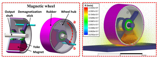 In the process of the adsorption force production of the magnetic wheel, most magnetic sensing lines come from a small part of the magnet close to the wall surface. Therefore, a radial magnetized fan magnet (Nd2Fe14B) was selected as the excitation source to reduce the weight and provide a strong adsorption force. Yoke iron was used to collect magnetic induction lines because of its high permeability that can reduce magnetic flux leakage and improve the utilization ratio of magnetic energy. Figure 2 shows that the fan magnet was placed in the suspension of the wheel, which could rotate relative to the wheel hub. When the output shaft transmits motion to the hub through a key, the permanent magnet always remains relatively still with the wall and does not rotate with the hub, which not only maintains a constant adsorption force but also avoids relative motion with the wheel. Actively reducing the adsorption force between the magnetic wheel and the wall, that is, the magnetic wheel demagnetization, is necessary to facilitate the robot detachment from the wall after the detection task. A small tangential force can be used in the adsorption state to force magnet rotation relative to each other, which can reduce the adsorption force between the magnet and the wall. Thus, a fast demagnetization mechanism was designed on the basis of the lever principle, which could facilitate magnet rotation around an output axis, thus completing the demagnetization.