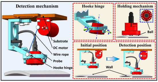 Figure 5 shows that the detection mechanism is fixed on the robot through the substrate. Hooke hinge structures enable a detection mechanism to have three DOFs, which can help detection mechanisms be perpendicular to kinds of complex wall surfaces. The torsion spring is installed on the rotary shaft of the hooke hinge mechanism. This hinge can provide torque force to press the probe on the wall surface to ensure the detection effect and improve detection accuracy. The hooke hinge mechanism is connected with the DC motor rocker arm through a wire rope. The DC motor rotates to lower the probe in the detection state. On the contrary, the DC motor rotates in reverse to lift the probe away from the wall in the non-detection state. The detection mechanism can be manually fixed into an L-shape by the locating pin after the removal of the wall-climbing robot from the wall surface. The holding mechanism in the hooke hinge mechanism is used to fix the detection probe, and different detection modules can be conveniently replaced to complete different detection tasks. In addition, eight stainless steel beads are installed uniformly on the probe holding mechanism to convert sliding friction into rolling friction to avoid damage to the detection wall. The above structure ensures close contact between the end of the detection mechanism and the surface. Therefore, detection efficiency can be guaranteed.