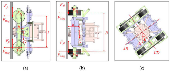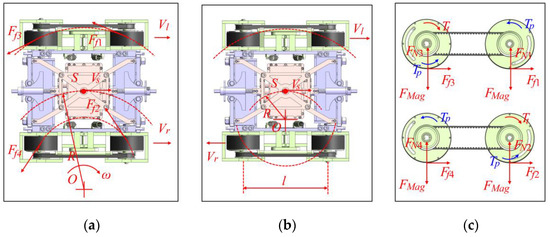 When , the center of rotation is outside the robot (as shown in Figure 8a); when , the center of rotation is inside the robot (as shown in Figure 8b). The condition of was taken as an example for force analysis. The horizontal to the vertical rotation of the wall-climbing robot was taken as the model to analyze the strained condition. The torque balance formula with point O as the center of rotation, as shown in Formula (6), was established to solve the required output torque of the motor. A mechanical model of the following turning states was obtained: