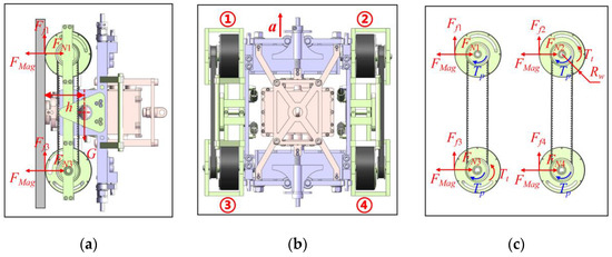 Dynamic analysis is similar to static analysis when running vertically upward. However, the existence of acceleration and the difference in the friction coefficient should be considered. Assuming that each wheel performs pure rolling motion without sliding, the mechanical model was obtained, as shown in Figure 7.