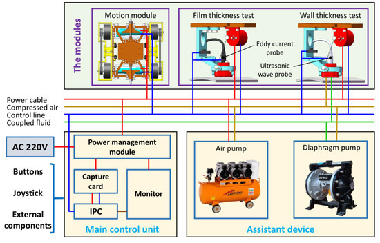 The robot is controlled remotely by external input devices, such as buttons in the control box. Control instructions are transmitted to the motors on both sides of the moving mechanism through the RS485. The motion pattern of the robot can be changed by adjusting the rotation speed and direction of the wheels on both sides. Simultaneously, inertial navigation information is used to adjust the running state of the motor to facilitate accurate movement. The distance between the detection device and the wall surface can be actively adjusted by controlling the motor steering in the flexible detection mechanism. The passive adaptability of the robot is used to ensure that the probe is perpendicular to the wall. Data obtained by probes are transmitted back to the main control unit in real-time via RS485 and displayed digitally. The robot can measure the thicknesses of the wall and paint film by, respectively, using ultrasonic and the eddy current probes. An air compressor and a diaphragm pump may be required during wall thickness measurement when using ultrasonic sensors to spray the coupling fluid near the probe to assist the robot in completing the wall thickness detection.