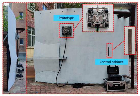This chapter discusses the movement and detection performance tests of the wall-climbing robot to verify the rationality and feasibility of the above-mentioned structure, control system, and the correctness of the mechanical theoretical analysis. The experimental facility mainly comprised the robot system and a cylindrical façade. Figure 11 shows a vertical circular steel plate, with a radius of 8 m and a wall thickness of 5 mm, which was used to simulate the tank environment. The detection robot system included the robot body, the control box, and auxiliary equipment. The air and diaphragm pumps of the auxiliary device provided coupling fluid for ultrasonic thickness detection. Operators controlled the movement and detection of the robot through the control cabinet to complete the detection task of the wall surface.