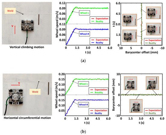 The robot could move safely and stably without slipping, falling, and other instabilities during the experiment. This finding indicated that the robot has good adsorption performance and adaptive capability. The synchronous belt is used to drive wheels on the same side. Therefore, the four-wheel robot could be simplified to the form of two wheels on right and left. The data in Figure 12a reveal that the rotation speed of the wheels on both sides during the vertical upward movement remained at 0.09 m/s despite slight fluctuations, and the position of the mass center did not deviate significantly in the horizontal direction. The data in Figure 12b show that the rotation speed of the wheels on both sides remained at 0.15 m/s in the horizontal circular motion of the robot, and the center of mass did not deviate significantly in the vertical direction. The above experimental data prove the steady and accurate robot movement on the circular steel plate.