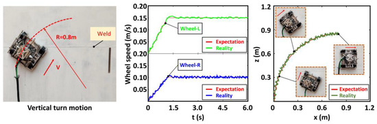 The robot did not lose its stability and completed the right turning movement from the vertical direction to the horizontal direction in the above experiment. The left and right wheel rotation speeds were, respectively, set at 0.15 m/s and 0.09 m/s; therefore, the expected theoretical turning radius was 0.8 m. The figure above reveals that the rotation speed of the wheels on both sides slightly fluctuated up and down around the theoretical value. The adjusted trajectories show that the robot completed the turn, albeit with some deviation due to gravity.