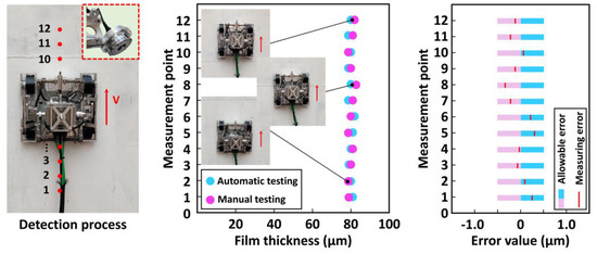 The robot could move accurately and complete the corresponding detection process during the experiment, thus finally achieving the measurement and data recording of paint film thickness. A comparison of the two above-mentioned sets of data revealed that the thickness of the paint film automatically detected by the robot was 80 um, which was close to that detected manually. Allowable error bands (±0.5 um) were set with industrial testing requirements after consulting relevant testing manuals, and all the measured values of the marking points were found to be within the allowable error band. The maximum error was 0.3 um, appearing at the eighth marker, which also met the detection requirements.