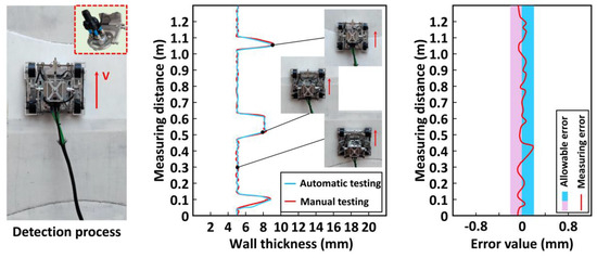 During the experiment, the robot could effectively complete the detection process and conduct automatic detection continuously. Similarly, allowable error bands (±0.2 mm) that met the requirements of industrial testing were set for wall thickness measurement. Figure 15 intuitively shows that the robot could continuously detect the thickness of the steel plate, and its thickness changed from 5 to 8 to 5 mm, which was similar to the manual measurement result and met the detection requirements. The two kinds of test data considerably fluctuated at the welding seam due to the influence of welding quality and position deviation of measurement points. Thus, the detection accuracy problem at the welding seam was temporarily disregarded. Stable data could be collected at other locations, and the test results met the test requirements. The maximum error of measurement was +0.2 mm, which was also within the required error range and met the detection requirements.