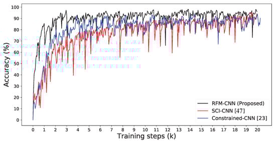 Figure 5 depicts the training accuracy curves for our proposed RFM-CNN, SCI-CNN [] and Constrained-CNN [].