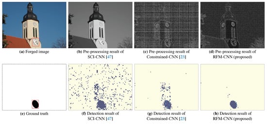 As Figure 6 reports, we illustrate the detection visualization results between the proposed RFM-CNN and the other pre-processing strategies. We inserted a red bounding box labeling the tampering region. It should be noted that the pre-processing result of SCI-CNN is actually grayscale version of inspected color image, since the pre-processing operation was not adopted in that method. One can also observe that both RFM-CNN and constrained-CNN were capable of suppressing low-frequency content while enhancing high-frequency content. Moreover, according to magnitude of mismatch detection, RFM-CNN had a higher ability of feature extraction using constant filter, compared with Constrained-CNN and SCI-CNN. Therefore, from Figure 5 and Figure 6, one can conclude that the proposed RFM-CNN performs effectively in accelerating the convergence of neural network and assisting the CNN module to better extract features precisely.