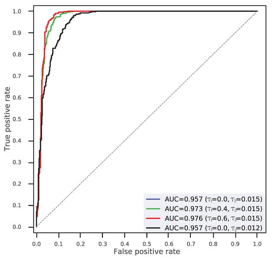 Table 2 describes the performance of our proposed RFM-based detector (i.e., an average ACC of 92.2%). As Table 2 illustrates, when decreased from 0.6 to 0, the ACC decreased from 94.9% to 90.4%. In other words, the RFM in the fusing stage can effectively reduce mis-classification, and meanwhile refine tampering detection. Figure 7 describes the ROC curves obtained from different threshold and , where TPR achieves high values even at a very low FPR. Thus, the findings supported the fact that our detector can precisely identify forged images with a low mis-classification rate.