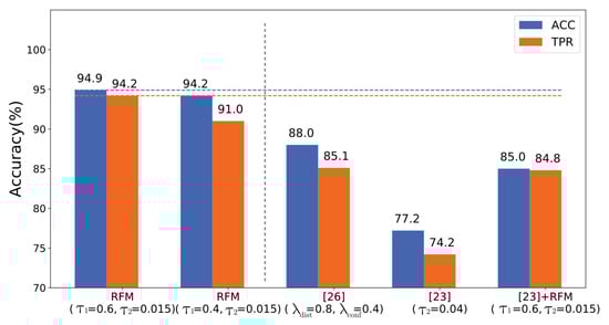 Figure 8 presents the detection results of the RFM-based detector with various thresholds and , together with the other prior-art methods. Compared with methods proposed in [] and [], the RFM-based detector achieved the best accuracy of 94.9% when . Additionally, when we adopted the RFM algorithm to refine CNN features of [], both ACC and FPR gained a remarkable enhancement. The main reason is that [] adopts the strategy based on each isolated patch without taking features of adjacent patches into consideration, while our proposed RFM algorithm reduces the mis-classified result caused by one single patch, and meanwhile improves the accuracy.