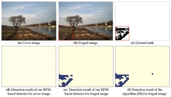 Inspired by the aforementioned effective high-pass filter, some researchers utilized a pre-determined predictor to produce a series of residual pixels. Then, these residual pixels are exploited as low-level forensic features. High-level associations are formed by subsequent detection. For instance, Bayar and Stamm [] combined a constant filter with a trainable convolutional filter in the pre-processing stage to enhance the robustness of detection. Subsequently, they used a new type of CNN layer (referred to as the constrained convolutional layer) for designing a universal detector []. Although this approach [] reportedly achieved high detection accuracy, its theoretical performance for image tampering localization is still unknown. Moreover, each isolated patch-wise detection result is hardly analyzed together, leading to that the mismatched results of detection to some extent decrease the resolution of tampering localization (see Figure 9). However, in this paper, due to our proposed RFM algorithm, that limitation can be perfectly overcome.