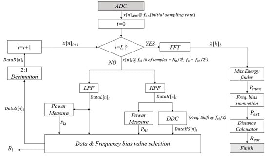 DataS[n]iis down-sampled by 2:1 decimation process and is converted to DataD[n]i for the next loop operation. DataD[n]i is the same as x[n]i+1, which is the input data of the i+1-th loop operation and the number of samples is reduced to a half of the previous loop’s input data, x[n]i+1. If the iteration of loop is performed for L times, then the FFT operation is performed for the reduced N0/2L sample data, and the frequency-domain data, X[k]L, is generated. By using the frequency-domain data, Pmax is obtained from Equation (9), which is a bin number with the maximum energy value. Since Pmax is the value obtained from the results of FFT processing with the reduced sample data, Pmax has to be adjusted by using the bias values, Bi, stored during the loop operation. The adjusted bin position, Pest, with the maximum energy value can be calculated by using Equations (10) and (11). Pest can be the same value as the estimated bin position of the FFT having the maximum energy value in the existing algorithm, which has to use the large number of FFT points. By using Equation (12), finally, the estimated distance to a target, Rest, can be obtained.