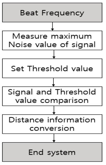 Section 3, set a threshold to find the maximum noise value. After that, the threshold value is set based on the user’s set value, and the pattern generated for the value higher than the threshold value when a signal corresponding to a minority multiple of the frequency resolution is received is compared with the threshold value to obtain distance information. The algorithm ends in the process of conversion.