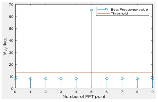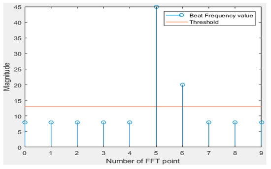 Figure 6 shows that the signal corresponding to 16 cm can be detected. Using the above examples, magnitude values can be 20 and 45 at FFT bin numbers five and six, respectively, when a signal corresponding to 17 cm comes in. Since the distance resolution of the system is 3 cm, the distance is analyzed from the pattern through the same process as above for 19 cm, 20 cm, and 21 cm. By adopting this principle, more accurate detection could be possible than the precision given by the bin spacing of FFT.